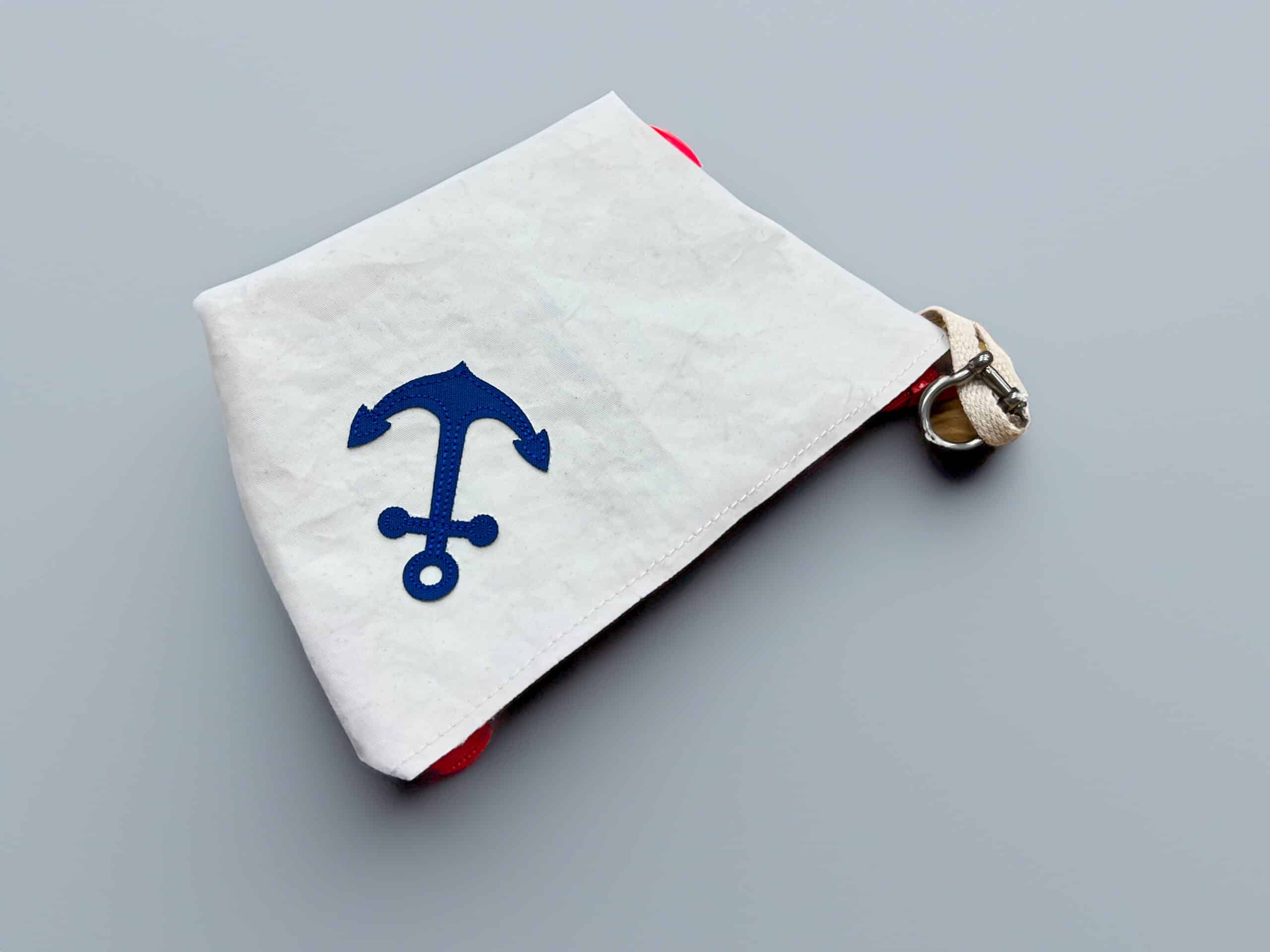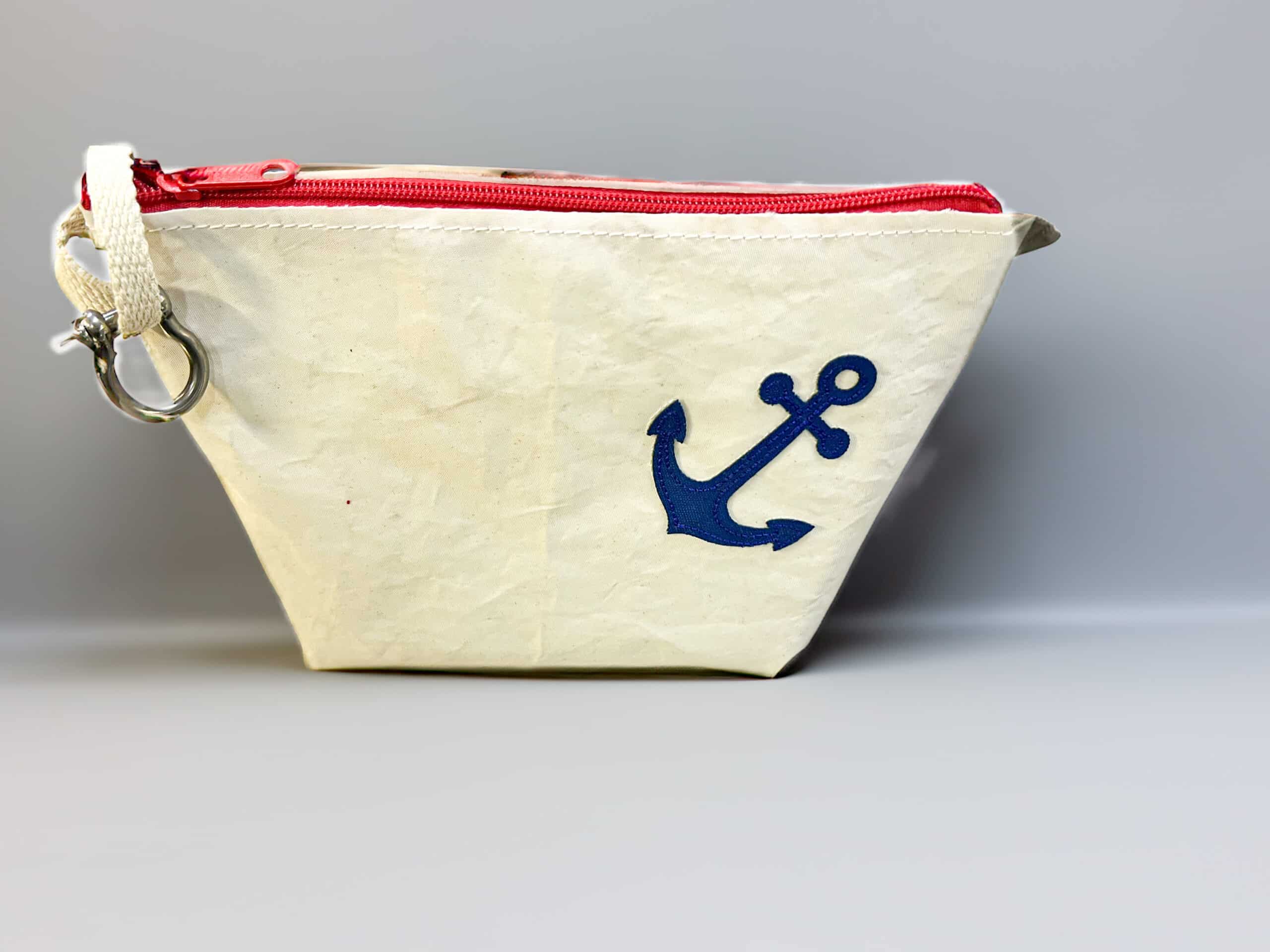 Poręczna kosmetyczka wykonana z używanego, wodoodpornego żagla, idealna jako praktyczny organizer, niewielka kosmetyczka podróżna lub estetyczny piórnik. Jej kompaktowy rozmiar sprawia, że jest niezwykle wygodna w codziennym użytkowaniu i łatwo mieści się w torbie, plecaku czy żeglarskiej koi.