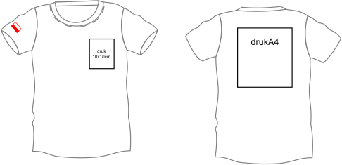Każda koszulka w pakiecie może zostać zadrukowana w trzech miejscach: