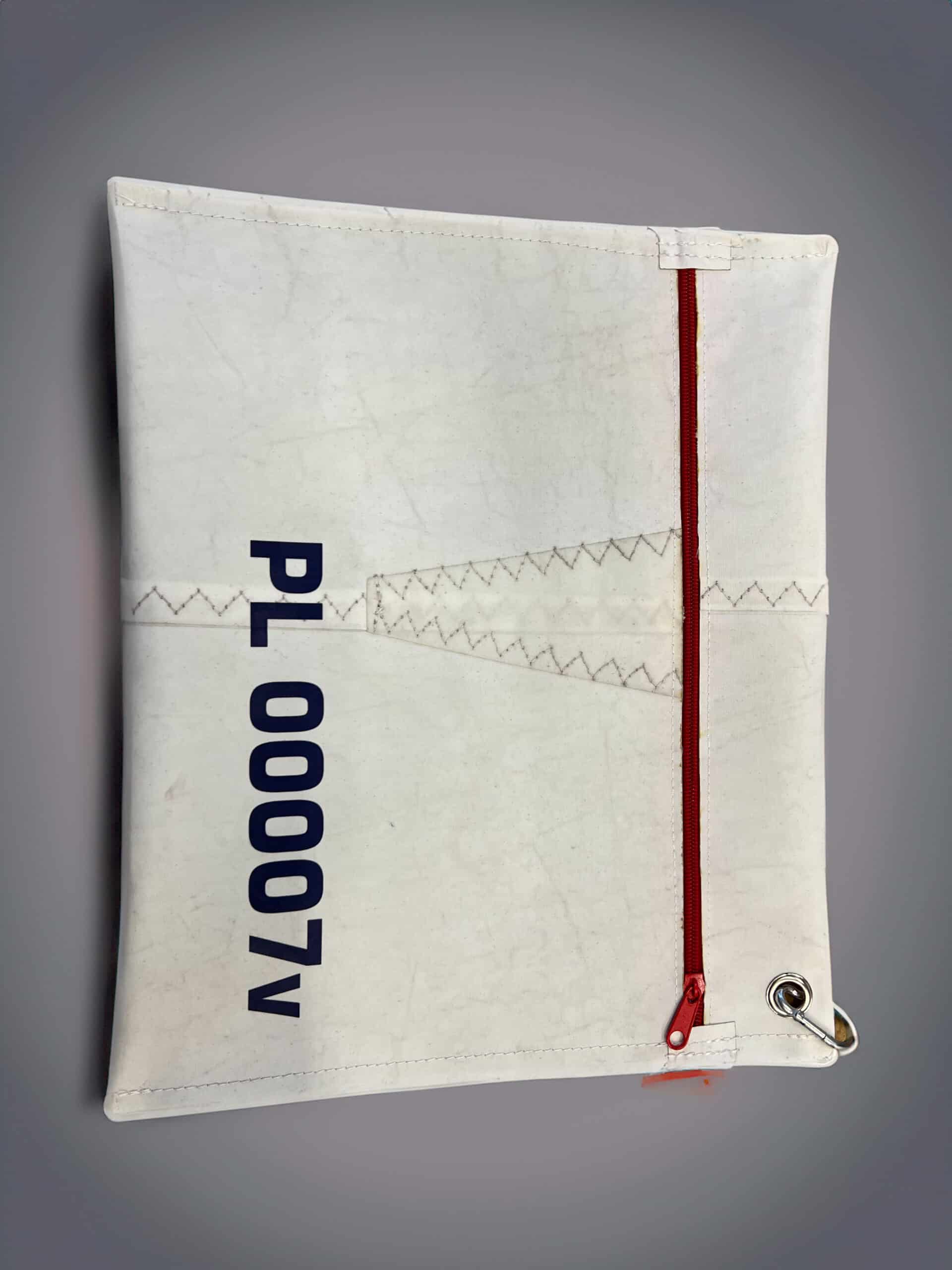 Profesjonalna teczka wykonana z używanego, wodoodpornego żagla, zaprojektowana jako trwały i gustowny sposób przechowywania dokumentów. Jej konstrukcja zapewnia odpowiednią sztywność i ochronę, dzięki czemu świetnie sprawdzi się zarówno podczas pracy biurowej, jak i na pokładzie jachtu, gdzie liczy się odporność na warunki atmosferyczne.